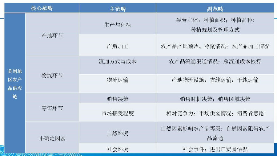 还有一个方面,从文献出发,有很多人研究贫困,因为这是热点问题,有农经的,有社会学的,甚至有哲学的、经济学的,但是很少有人从销售的、供应链的视角来研究贫困地区的滞销问题。还有供应链的问题,所以我们就做这么一个研究,从更加全面的供应链角度,供应链不同节点之间的联系,去看怎么样减少贫困地区的农产品滞销。我觉得利用扎根这个很简单的理论,来总结贫困地区农产品滞销的供应链理论框架,给产业扶贫和乡村振兴有效衔接提供参考。