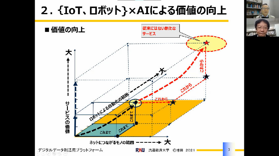 增田悦夫教授首先从第四次工业革命谈起,介绍了推动第四次工业革命的三项先进技术:物联网(Internet of Things,简称IoT)、机器人和AI(即人工智能)。物联网是将真实事物连接到互联网的一种技术,机器人可以代替人类完成各种作业,将AI内置于物联网和机器人的软件中可以有效地提高二者的效率,据此增田教授预计第四次工业革命的结果是会出现一种新的工业形式。接着增田教授用一张三维图像来展示: