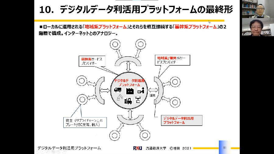最后,增田教授结合日本物流过去和现在的情况对未来的发展做出了一定的预测。在2000年左右日本政府提出预约型需求对应物流,即物流资源的联合开发,从相关公司之间共享送货卡车和仓库,到货运代理行业通过使用嗅觉搜索服务来匹配货运,然后由托运人再寻找车辆。现在各种供需匹配系统都已出现,物流衔接多样化,随时有需,随时应付,即时性很高,这就比原先的预约型更进一步。今后的发展方向是预测型,通过采集到的海量数据在智能平台上进行预测需求的可能性,当前的物流系统加上数据化平台会使物流更加完善高效。如图是该智能共享平台的最终形态: