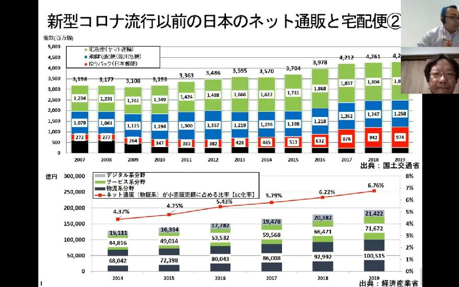首先,宫武副教授向我们简单介绍了在新冠肺炎流行之前,日本的网上购物,网上送货和宅急便的情况。着重介绍了大和运输,佐川急便和日本邮政三家最大的公司的情况。通过图表可以分析得出,大和运输,佐川急便和日本邮政三家最大的公司几乎垄断了日本的整个运货行业。在新冠肺炎流行之前,日本的网上购物虽然在增长,但是占比还是很低。