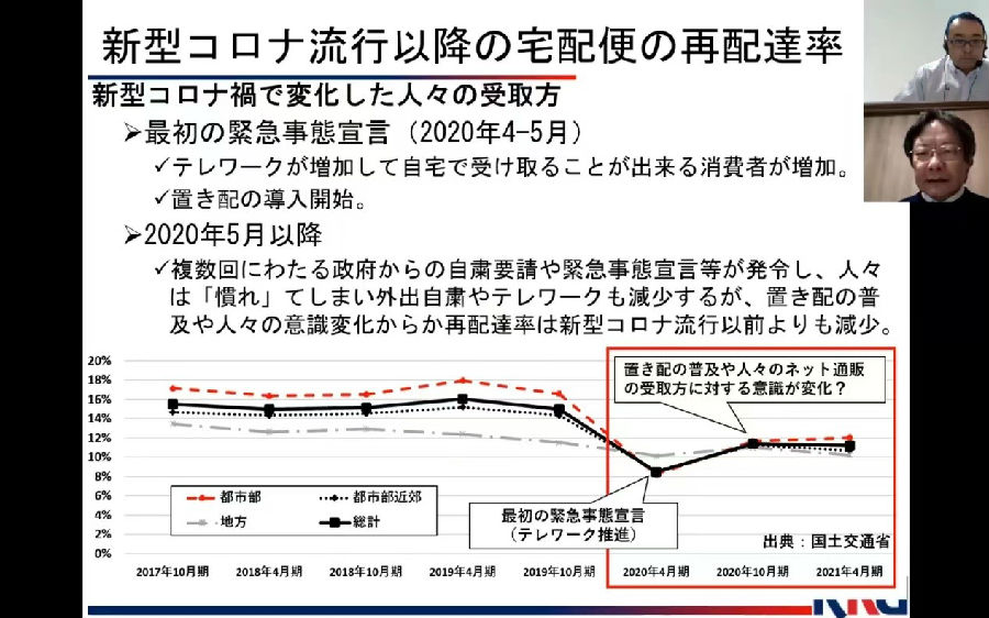 新冠肺炎流行以后,利用网上购物这个服务的人数越来越多。另外,还有像是中国的饿了么,日本也有相似的公司,疫情流行以后,食品的运输也开始增加。还有一个变化就是客人会指定送货员将货物放在客人所指定的地方,比如说门前放置不面对面接触。退货方式在新冠肺炎爆发以后也慢慢的增加了指定地点。亚马逊和日本邮政为了减少第二次配送,已经开始实验性的方案。为了避免面对面接触,将货物放在一个特定的位置,在疫情爆发后,引起了大家的关注。另外呢,就是宅急便服务的量在新冠肺炎流行以后也增长的非常快。