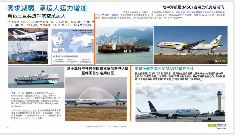 而目前运力处于过剩状态,需求减弱,运价大幅度波动,引发全球经济衰退。根据康德拉季耶夫周期理论,在一定周期内,每一次科技进步,都会伴随着发生经济危机,英国历史学家尼尔·弗格森也称世界正处于政治和经济动荡的时代。各行业都纷纷对全球经济表示担心,按照国家统计局制造采购经理指数和非制造采购经理指数,从3月-10月出现6个月低于临界值,表明制造业生产有所回落,市场需求减少,进入收缩状态。不仅是中国民航增加了货机的投入,全球海运三巨头——法国的达飞、北欧的马士基,瑞士的地中海,也纷纷进军航空承运人的阵营。目前全球流动的货运量,虽然种类有所增减,但由于包装的改善以及科技的进步,物品本身重量在不断减少,所以赵经验先生表示,为迎合在特定情况下增加的货量,货机运力的投入也需要承担一定的风险。
