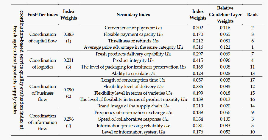 在对结果的分析时结合了物流、资金流、信息流和业务流四个供应链协调的主要方面。并提到文章的创新点:一是区别于传统的以协调为基础的服务,本文致力于服务供应链的评价标准;二是设计问卷进行数据收集;三是提出了一种改进的MCDN评价指标敏感性的分析方法,以指导优化决策,丰富了理论研究成果。最终研究结论结论:资金流动对生鲜农产品供应链平台的影响最为敏感,这意味着在做出优化决策时应对其进行设计和实施。