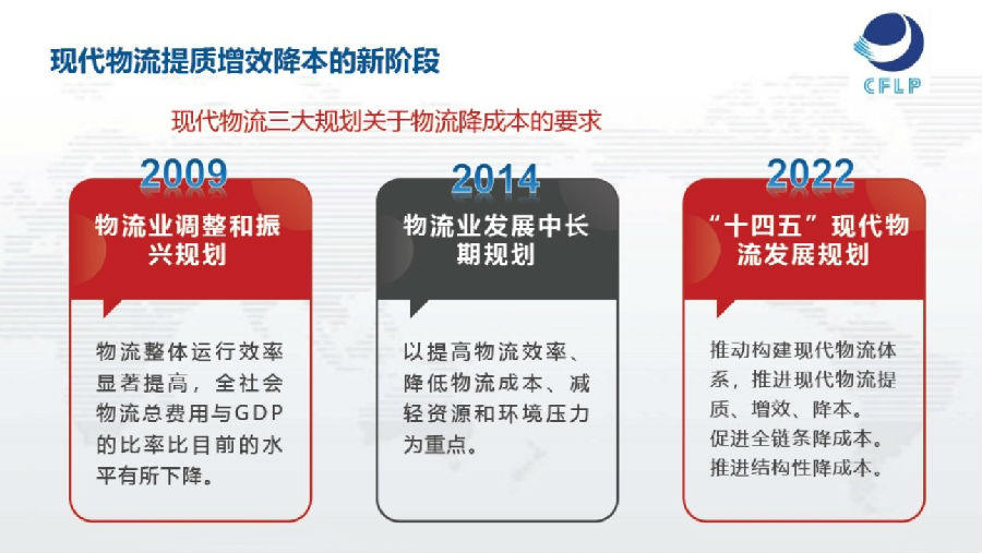 3.“十四五”要重视两个政策方向和范式的变化,在中长期规划之前都提的是“物流业”,2022年“十四五”规划提升到“现代物流”这个层次,不仅仅关注物流业,更多关注“全链条”、“结构性”、“系统性”的供应链物流成本。