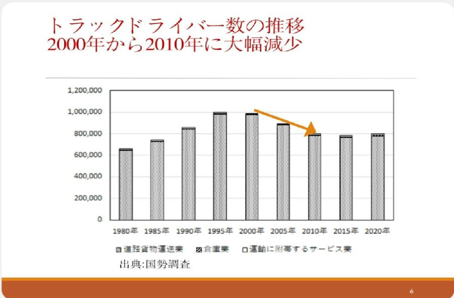 接下来,又讲述到轻货车从业者的激增。轻货车,即有一辆小型货车即可从事的业务,不需要运行的管理人员,因此参与门槛低。在新冠疫情中,各公司为了完善基层配送体系,不断扩大轻货运从业者人数。2018年有169000人,2021年已经达到了209000人。这些轻型货车没有数量的限制,所以个体户也大量的参与到其中。轻型货车有一个较大的问题,即效率较低。轻型货车的机载效率,仅有25%左右,而一般的货车的机载效率是40%左右。