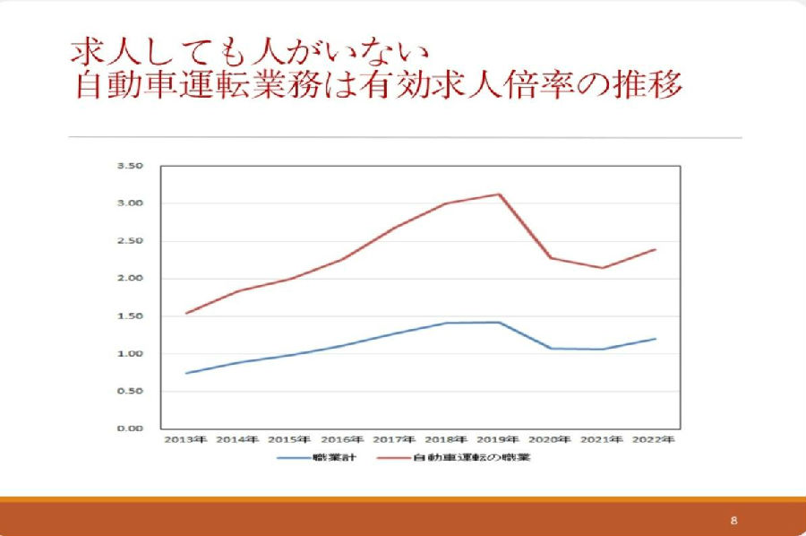接下来,矢野教授解释了想成为货车司机人少的原因。现在日本统计数据显示,货车司机的平均收入低于其他行业,然而工作时间却比其他行业高出一成左右。这意味着货车司机的时薪很低,这是一个及其严重的问题;另一方面,货车司机的隐形工作量也是巨大的,司机帮忙装货卸货,这无形间加重了他们的工作量,因此对于年轻人来说,货车司机是没有吸引力的。因此,为了解决人手不足的问题,促进货车司机劳动环境的改善是非常有必要的。矢野教授提到,物流行业的改革不仅对物流公司有利,对从事物流行业的个人同样有利,所以推动物流行业发展是有必要的。2024问题要求政府严格管理,否则将会有高度的供给缺口问题出现。