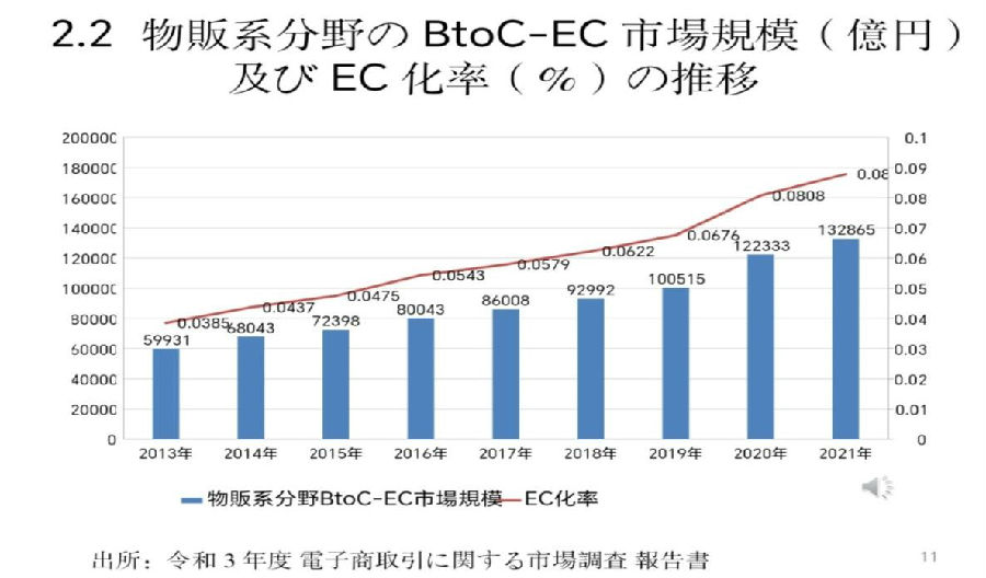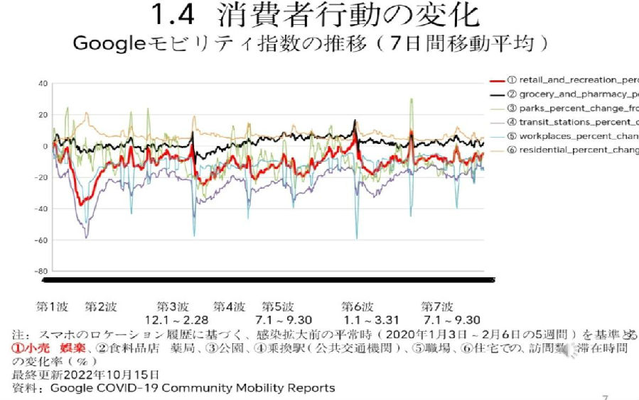 在紧急事态宣言发布以后,消费者减少了外出和实体店的购买消费。该图是浏览数据和检索数据的汇总,图中对于游乐设施以及食品药品等生活用品的搜索量都是大幅度减少的。而在疫情恢复之后,消费者对于这些数据的搜索量也慢慢恢复。新冠疫情初期,人们外出的减少导致网购消费呈极速增长的态势。2020年5月比2019年的网购比率同比增长的16.5%,2021年4月,这一态势进一步增长。从中可知,食品的网购消费始终保持较高的比率,而家电只在疫情之初有着较高的比率,在2022年转为负数。可以看到,不同的商品在疫情期间的消费是不同的。