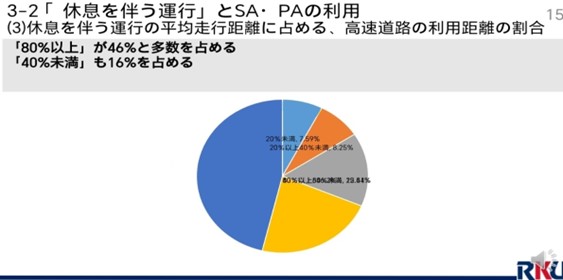 长距离运行的车辆中,有80%的情况要使用高速的人数占到了46%,还有40%的公司只有16%的情况才会使用高速,这是因为长距离运输需要足够的休息。剩下的就是不必使用高速的短距离运输。味水佑毅教授对这些司机进行了问卷调查,其中高达七成的人认为现在的高速休息设施或多或少存在着一定的问题。