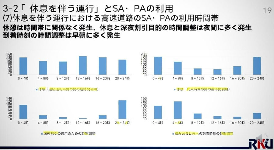 以上是对大家休息时间的一个调查统计。这里分别用到了休憩与休息,休憩是指短时间的休息;而休息则为更长时间的休息。休憩在日本意味着连续开四个小时车之后,是必须休息30分钟的。其次,日本的深夜,即凌晨0点到4点,使用高速公路便宜30%。因此,很多人为了减少成本会选择深夜使用高速公路,他们就会在休息设施之中暂时休息。其实休憩是在各个时间段都有可能发生的,但是休息却只会在夜晚的时候发生,这是因为大家会在SA和PA的休息设施之中待到24点以后再出高速,来享受便宜的价格。
